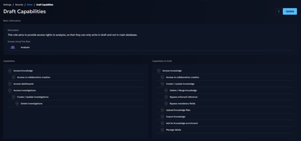 In this new version, OpenCTI adds the concept of control of capabilities in draft mode (Enterprise Edition feature), users can be allowed to create/edit drafts without being allowed to validate/merge them. This enables a first step towards a review/approval process for publications. It gives you flexibility where draft creators are not necessarily draft validators and you can specify granular RBAC controls. It also aligns better with your security and data governance policies in the context of CTI.